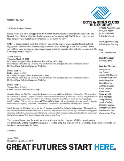 We are proud to Present our Dynamic and Diverse NMDI team—dedicated individuals who generously devote their time and talents to advancing the mission and vision of the National Multicultural Diversity Institute. Their unwavering commitment drives meaningful change and inspires our community every day.